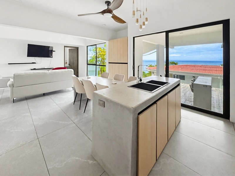 Thoughtfully designed to capture natural light and stunning ocean vistas, the home showcases an open-concept layout that seamlessly connects the living, dining, and kitchen areas.