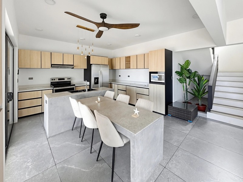 The modern kitchen is equipped with custom cabinetry, stainless steel appliances, and a striking concrete island, perfect for entertaining or everyday living.